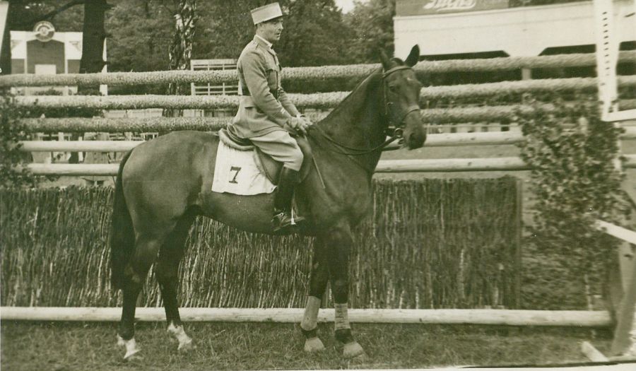 opis: por. Cavaillé na koniu Champagne stoi przed przeszkodą o wysokości 210 cm, którą pokonał wygrywając Championat Skoku na wysokość, na potniku nr 7