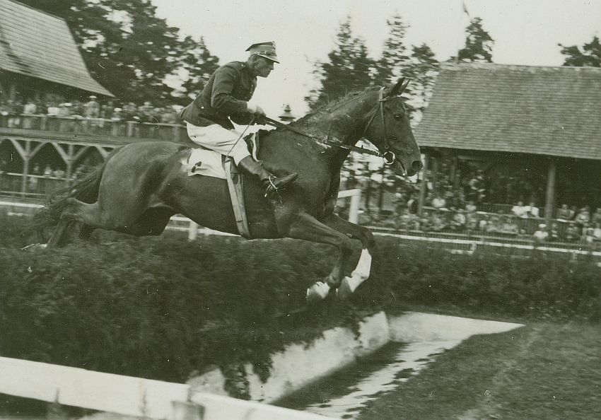 | Nr. inwentarzowy: MŁJ-XVI 1761 / 03 / 022 opis: Tor wyścigów konnych - wojskowy bieg na przełaj im. Prezesa P.Z.J. płk. Zbigniewa Brochwicz-Lewińskiego. Rtm. Michał Bohdanowicz (mundur, jasne bryczesy) na koniu Żart (na potniku numer 1) skacze przez żywopłot z rowem, w tle trybuny, Para Bohdanowicz - Żart zajęła w tym biegu 1. miejsce.czas powstania - daty graniczne: 1939-07-02 - 1939-07-02miejsce: Wilno, Pośpieszkaosoby: Rtm. Michał Bohdanowicz 1903-48 (syn Jana Bohdanowicza i Marii z Cywińskich, brat Heleny i Krystyny, mąż Wandy z domu Leskiej. W latach 1932-36 i przed II wojną w 4 Pułku Ułanów Zaniemeńskich, od 1936 w 13 Pułku Ułanów Wileńskich; nazywany "Misiem". Podczas kampanii wrześniowej trafił do niewoli, zmarł niedługo po powrocie z oflagu).inne nazwy własne: PZJ; Polski Związek Jeździeckitworzywo: papier fotograficzny, błyszczącytechnika: odbitka żelatynowo-srebrowa DOP, czarno-białazespół: album rodziny Bohdanowiczówwymiary (wys. x szer.): 60 x 84 [mm] Koń: 1. Żart IV, maść kasztanowata - Manton xx - Żurna lub Żurka; hod. hr. Korzbok-Łącki, wł. M.S.Wojsk., w 1938 r. startował w biegach na przełaj w Poznaniu pod A. Szamotą; w 1939 r. startował w biegach na przełaj w Wilnie pod M. Bohdanowiczem i St. Chrząszczem, na zdjęciu: 1. miejsce