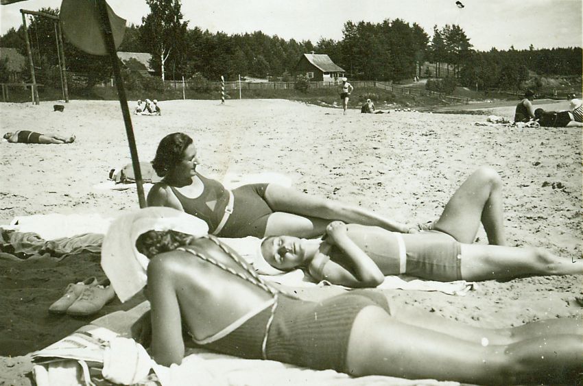 | Nr. inwentarzowy: MŁJ-XVI 1758 / 00 / 003 opis: Na plaży nad rzeką Wilią, na ręcznikach leżą (od przodu): blondynka z kręconymi włosami, Wanda Bohdanowicz, Dziunia (Jadwiga?) Grabowska. Kobiety w strojach kąpielowych (blondynka z głową przykrytą jasnym ręcznikiem lub innym kawałkiem materiału), Wanda w jasnym kapelusiku, Dziunia z gołą głową.data: czerwiec - lipiec 1935 r.czas powstania - daty graniczne: 1935-06-01 - 1934-07-31miejsce: Wołokumpie - kąpielisko niedaleko Wilnaosoby: Wanda Bohdanowicz 1908-1991 (z domu Leska); Dziunia (Jadwiga?) Grabowska.tworzywo: papier fotograficzny, błyszczącytechnika: odbitka żelatynowo-srebrowa DOP, czarno-białazespół: album rodziny Bohdanowiczówwymiary (wys. x szer.): 55 x 80 [mm]