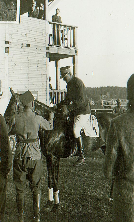 | Nr. inwentarzowy: MŁJ-XVI 1761 / 02 / 016 opis: Tor wyścigów konnych - po wojskowym biegu na przełaj Wiazynia (wieś w powiecie wilejskim, obecnie na Białorusi). Rtm. Michał Bohdanowicz na koniu Kazik po wygraniu biegu. Koń (na potniku numer 1), trzymany przez wojskowego stoi obok trybuny, z której spogląda kilka osób. Jeździec wyjął nogi ze strzemion i będzie zsiadał.czas powstania - daty graniczne: 1939-06-27 - 1939-06-27miejsce: Wilno, Pośpieszkaosoby: Rtm. Michał Bohdanowicz 1903-48 (syn Jana Bohdanowicza i Marii z Cywińskich, brat Heleny i Krystyny, mąż Wandy z domu Leskiej. W latach 1932-36 i przed II wojną w 4 Pułku Ułanów Zaniemeńskich, od 1936 w 13 Pułku Ułanów Wileńskich; nazywany "Misiem". Podczas kampanii wrześniowej trafił do niewoli, zmarł niedługo po powrocie z oflagu).tworzywo: papier fotograficzny, błyszczącytechnika: odbitka żelatynowo-srebrowa DOP, czarno-białazespół: album rodziny Bohdanowiczówwymiary (wys. x szer.): 83 x 60 [mm] Koń: 1. Kazik, wałach, maść skarogniada, ur. 1925 - Rock-Roy – Merilla, hod. H. Jechalskiego, wł. Wandy Leskiej-Bohdanowicz; w 1930 roku właścicielka trenowała go na ujeżdżalni W.S.Woj., startowała na nim m.in. w Warszawie, podczas Krajowych Zawodów Konnych w 1932 r.; w 1933 r. wygrywali na nim biegi przełajowe M. Bohdanowicz i J. Domański. W 1937 r. startował w Grudziądzu i Gnieźnie, na zdjęciu: 1. miejsce