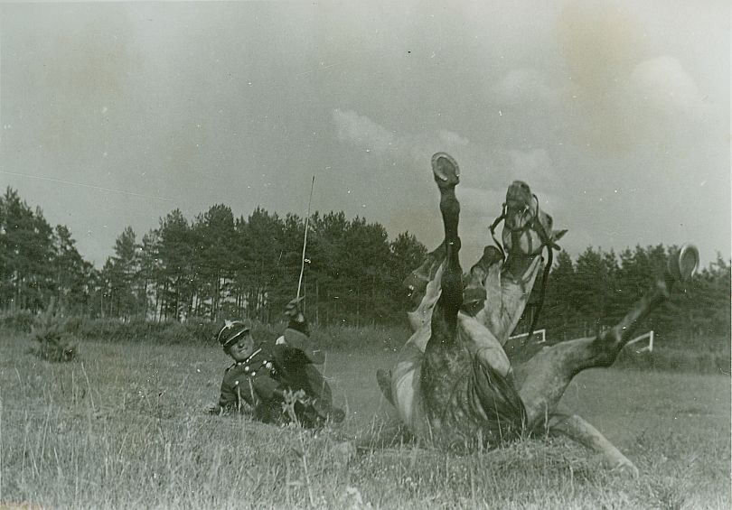 | Nr. inwentarzowy: MŁJ-XVI 1758 / 00 / 038 opis: Tor wyścigów konnych, Konkurs Otwarcia. Upadek por. Czesława Danielczyka. Dynamiczna scena - leżący na grzbiecie siwy koń i leżący na plecach porucznik w mundurze, z bacikiem w ręku. W tle żywopłoty, zagajnik.czas powstania - daty graniczne: 1935-07-04 - 1935-07-04miejsce: Wilno, Pośpieszkaosoby: Por. Czesław Danielczyk ur. 1902 r. (23 p.u., później rtm. w 17 p.u.).tworzywo: papier fotograficzny, błyszczącytechnika: odbitka żelatynowo-srebrowa DOP, czarno-białazespół: album rodziny Bohdanowiczówwymiary (wys. x szer.): 86 x 122 [mm]