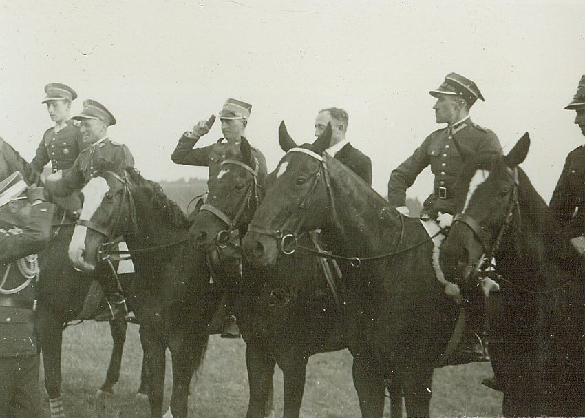 | Nr. inwentarzowy: MŁJ-XVI 1761 / 01 / 004 opis: „II Popularny Meeting P.Z.J.” na torze wyścigowym Pośpieszka pod Wilnem. Wręczanie nagród. Sześciu zawodników, którzy zajęli najwyższe miejsca, oficerowie w mundurach i H. Strzeszewski w stroju cywilnym. Rtm. Bohdanowicz wymienia honory z oficerem, który stoi przed szeregiem. Jeźdźcy i konie: ppor. Jan Kochański - Apasz, rtm. Tadeusz Sokołowski - Barnaba, rtm. Michał Bohdanowicz - Talar III, Henryk Strzeszewski - Ryś, kpt. Wojciech Biliński - Florek Siłacz, rtm. Narcyz Łopianowski - Sarna II.data: okres mitingu PZJ w Wilnie - 8, 10, 11 czerwca 1939 r.czas powstania - daty graniczne: 1939-06-08 - 1939-06-11miejsce: Wilno, Pośpieszkaosoby: Ppor. Jan Kochański 1914-44 (1 p.sz., zamordowany na Pawiaku); rtm. dypl. Tadeusz Sokołowski 1905-43 (1 p.sz., zamordowany przez Gestapo w Mińsku); rtm. Michał Bohdanowicz 1903-48 (13 p.u., zmarł po powrocie z niewoli); Henryk Strzeszewski 1895-1981 (kpt., inż., hodowca koni, po wojnie na emigracji w Wlk. Bryt.); kpt. Wojciech Biliński ur. 1903 (CWA Toruń, wybitny jeździec, po wojnie na emigracji w Wlk. Bryt.); rtm. Narcyz Łopianowski 1898-1984 (1 p.u., wybitny jeździec, po wojnie na emigracji w Kanadzie).inne nazwy własne: PZJ, Polski Związek Jeździecki; miting; Centrum Wyszkolenie Artyleriitworzywo: papier fotograficzny, błyszczącytechnika: odbitka żelatynowo-srebrowa DOP, czarno-białazespół: album rodziny Bohdanowiczówwymiary (wys. x szer.): 63 x 87 [mm] Konie: 1. Apasz, wałach, maść gniada, ur. 1928 - hod. Zbigniew Rojowski, wł. M.S.Wojsk., w 1939 r. startował na nim w Wilnie ppor. Jan Kochański, na zdjęciu: 1. miejsce, 1-3 nagroda 2. Barnaba (Bosfor), wałach, maść skarogniada, ur. 1932 - po Don Jouan i Kawa, hod. Franciszek Żmigrodzki, wł. Paulina Jaroszewiczowa; w 1939 r. startował w Warszawie pod właścicielką i rtm. Sokołowskim oraz pod T. Sokołowskim w Wilnie, na zdjęciu: 2. miejsce, 1-3 nagroda 3. Talar III, wałach, maść kasztanowata - hod. Bogumiła Hebanowskiego; ur. przed 1928, prywatny koń Michała Bohdanowicza, który startował na nim w konkursach ujeżdżenia, skoków (np. Mitingi Popularne PZJ 1938-39 i WKKW ("Militari"), biegach myśliwskich, skiringu, uczestniczył w ćwiczeniach wojskowych. Dosiadała go też żona Michała - Wanda (m.in. w 1937 r. w Grudziądzu).., na zdjęciu: 3. miejsce, 1-3 nagroda 4. Ryś, wałach, rasa: x, maść skarogniada, ur. 1923 - po Aino i Cichotka/Cichocka, hod. A. Piasecki, wł. Bazyli Nieczaj (starty w 1. poł. l. 30.), później H. Strzeszewski (starty w 2. poł. l. 30. m.in. w: Warszawie, Wilnie, Łucku, Jarosławiu, Gnieźnie)., na zdjęciu: 4. miejsce 5. Florek Siłacz, wałach, rasa: x, maść gniada, ur. 1924 - Huszar II - Lüsette, hod. K. Wickenhagen, wł. W. Bilińskiego, który startował na nim w 2. poł. l. 30. - m.in. starty w Warszawie, 1936-37 II m. w MP w skokach, w l. 1938-39 starty w Mitingach Popularnych PZJ w Wilnie, na zdjęciu: 5. miejsce 6. Sarna II, klacz, maść gniada, ur. 1924 - po Sadko i Kawka, hod. Marja Niemojewska, wł. M.S.Wojsk., 1 p.uł.; w l. 1938-39 N. Łopianowski startował na niej w Mitingach Popularnych PZJ w Wilnie, Baranowiczach., na zdjęciu: 6. miejsce