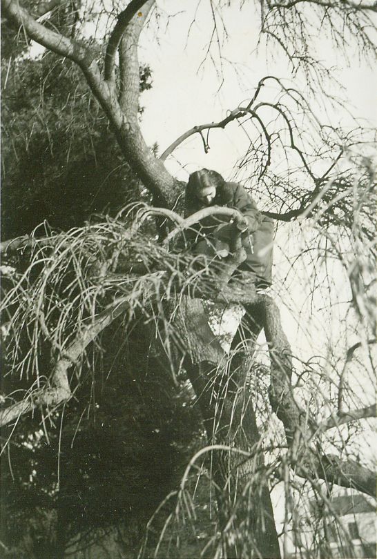 | Nr. inwentarzowy: MŁJ-XVI 1759 / 00 / 073 opis: Anna Leska w płaszczu z ciemnym kołnierzem na bezlistnym drzewie. W tle drzewo szpilkowe. Sądząc po widocznym w tle budynku, kobieta jest dość wysoko. Podpis w albumie: Anka jako Tarzan w dżungli.data: grudzień 1936 r. - styczeń 1937 r.czas powstania - daty graniczne: 1936-12-01 - 1937-01-31miejsce: Kalinowa - dwór należący do dzieci Edwarda Sapalskiego i Marii Adeli z Wierzbickich, dziś w ruinieosoby: Anna Leska 1910-1998 ("Anka", córka Juliusza Leskiego i Marii zd. Olszyńskiej, siostra Wandy i Kazimierza; członkini K.S.R.W.; później Leska-Daab, podczas II wojny światowej pilot w Wielkiej Brytanii).tworzywo: papier fotograficzny, błyszczącytechnika: odbitka żelatynowo-srebrowa DOP, czarno-białazespół: album rodziny Bohdanowiczówwymiary (wys. x szer.): 85 x 57 [mm]